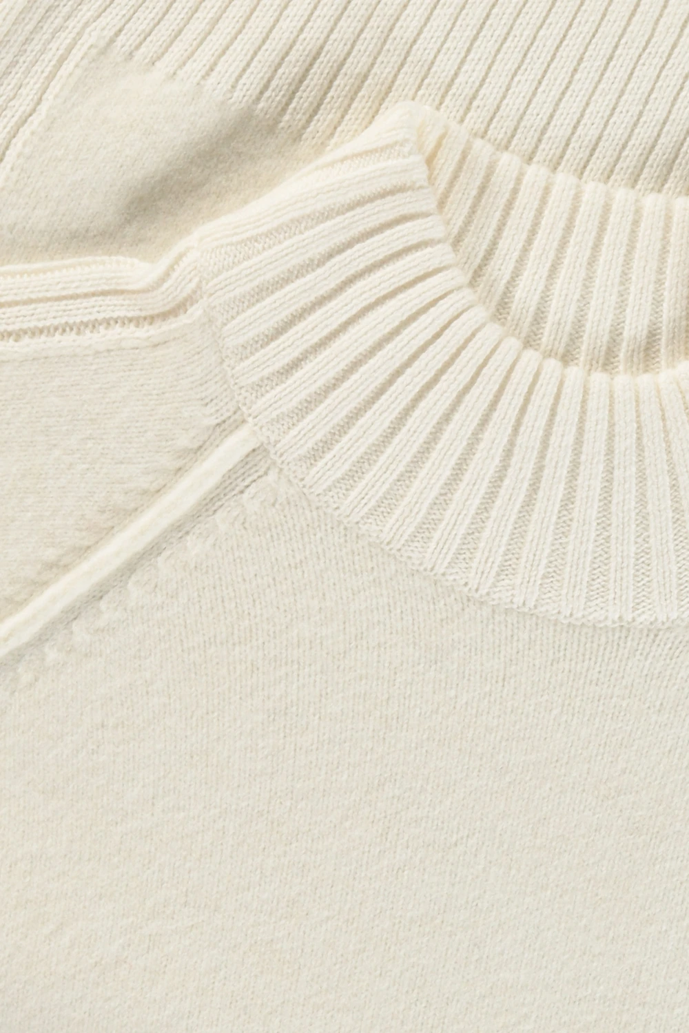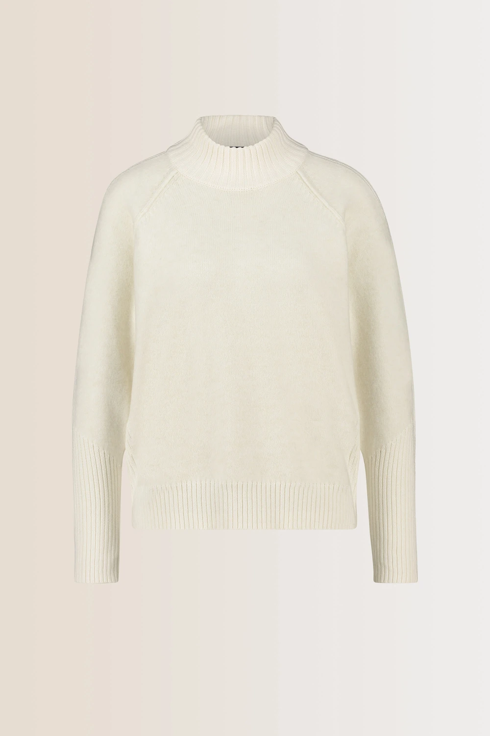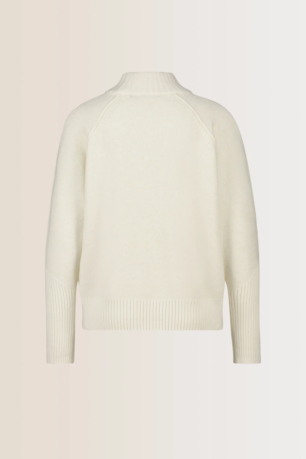 Offwhite coltrui – wolmix met gerecycled polyester. Recht & relaxed, opstaande col, lange raglanmouwen. Mix van wollige en gladde garens, ribgebreide details. Stijlvol ‘winterwit’ houdt je herfstlooks fris en licht.