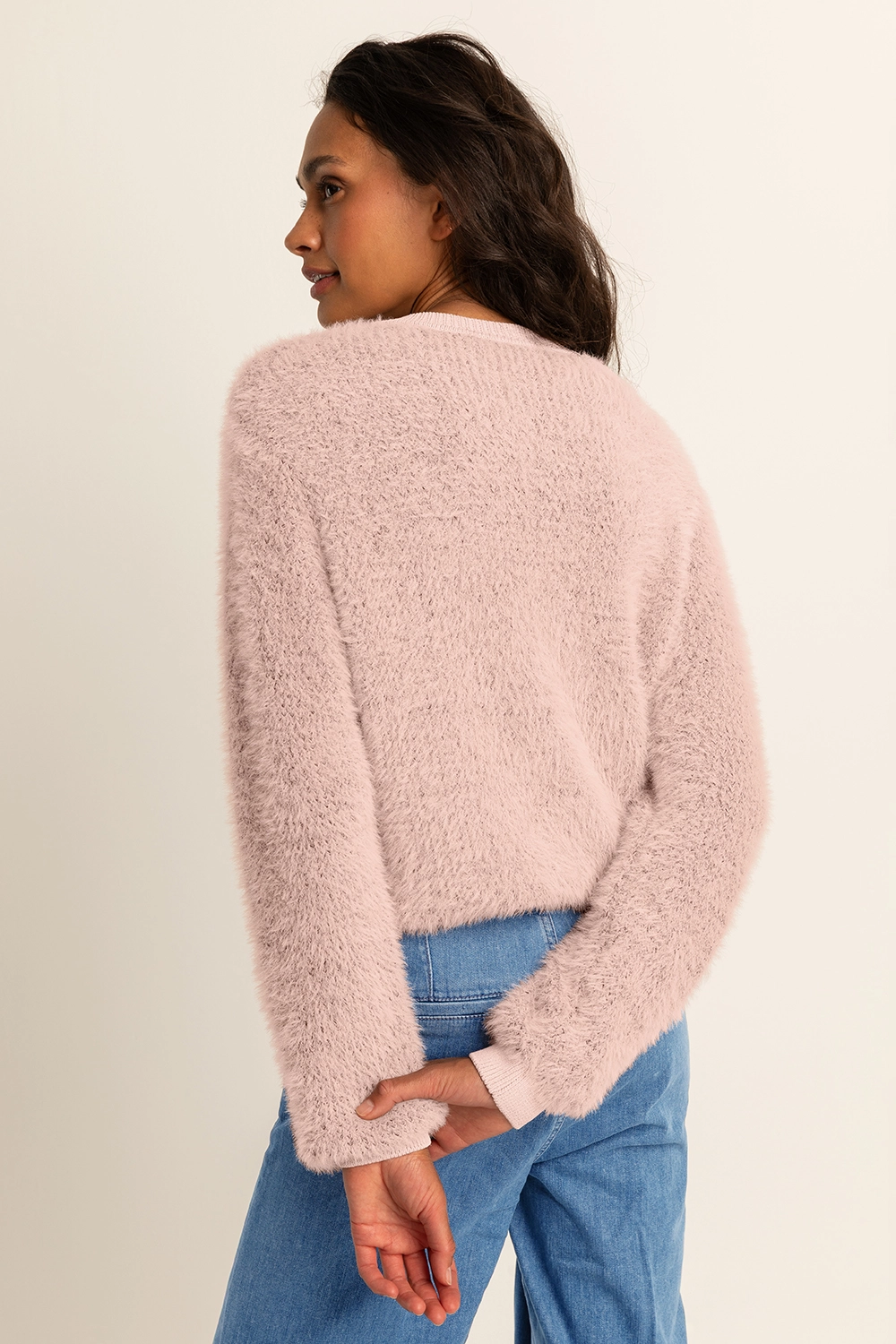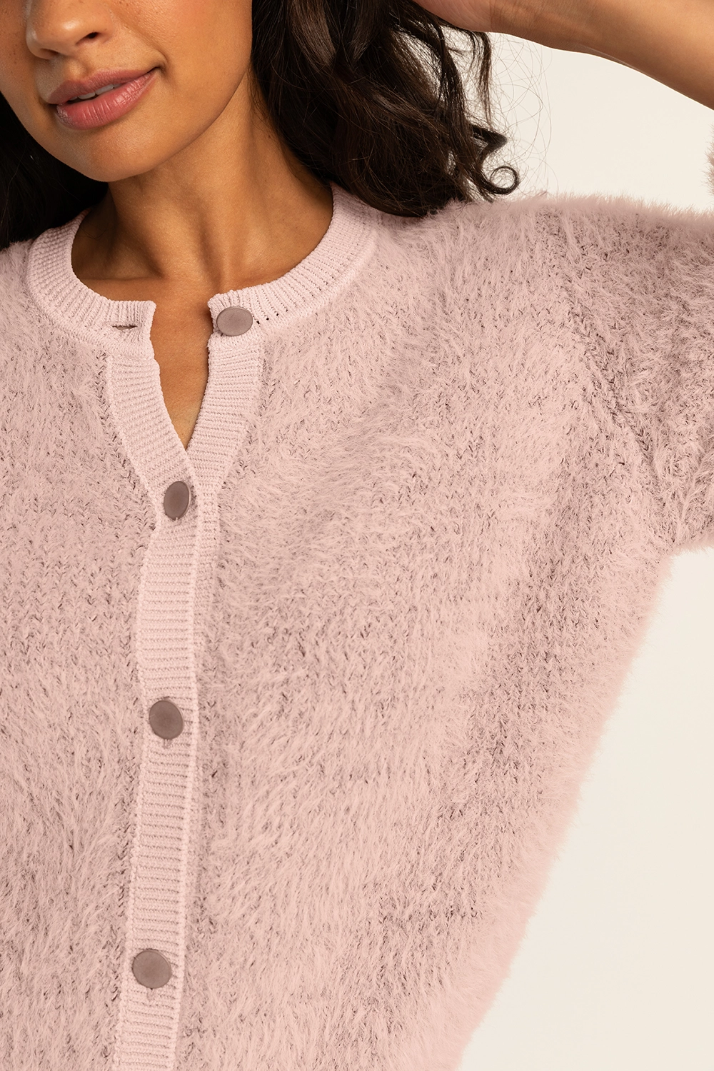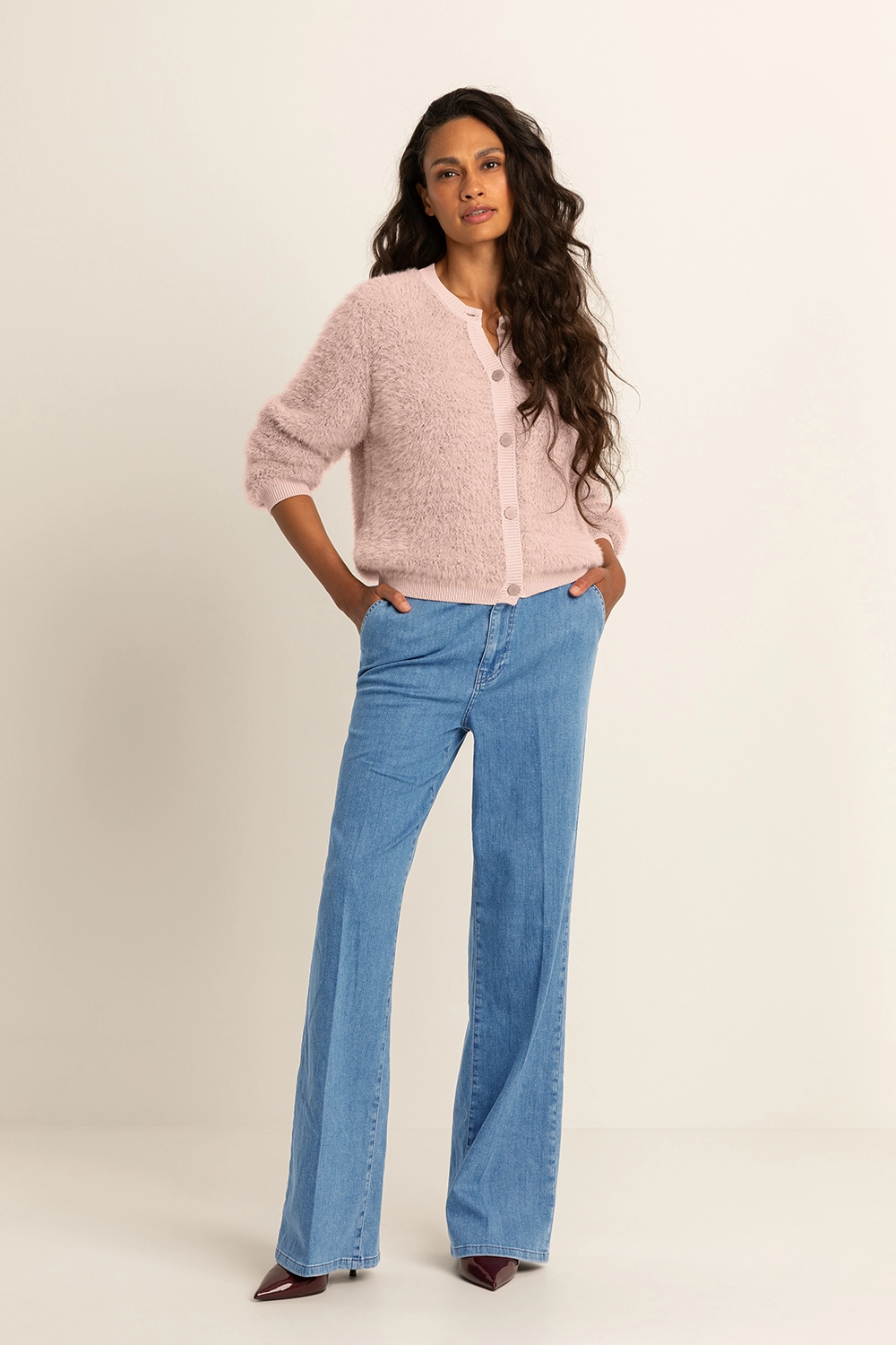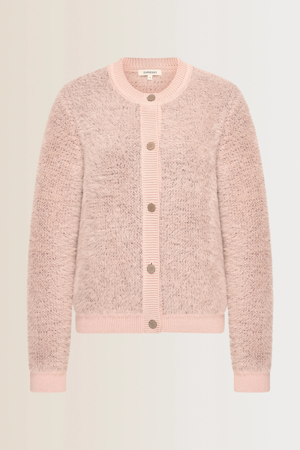 Lichtroze vest – Regular fit met ronde hals en lange mouwen. De fluffy textuur geeft dit vest een zachte, cosy uitstraling, terwijl de ton-sur-ton knopen en ribgebreide boorden zorgen voor een verzorgde afwerking. Perfect om open te dragen over een top of gesloten als trui.