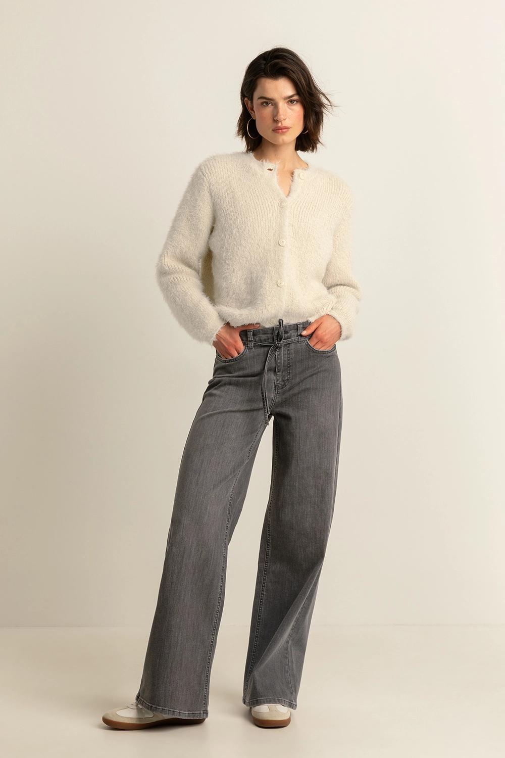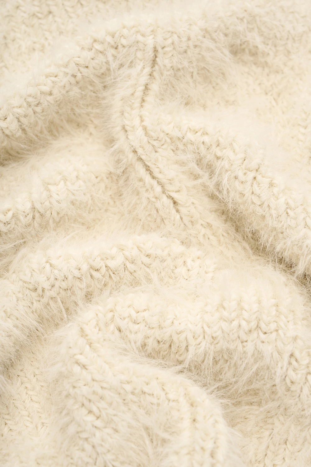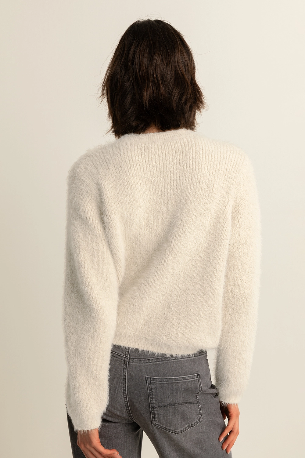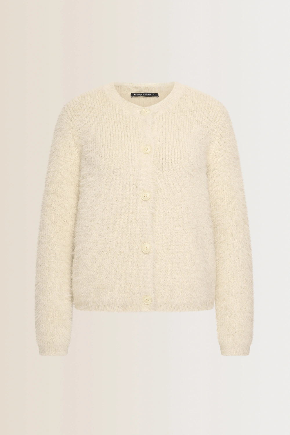 Ecru vest – Heerlijk fluffy en licht, met een subtiele glans en een tijdloze ronde hals. De grove structuur en knoopsluiting geven dit vest een eigentijdse, cozy uitstraling. Perfect om over een blouse of jurk te dragen.